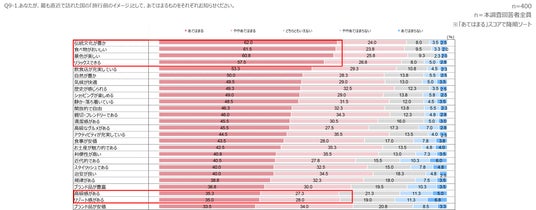 旅行後の印象は「伝統文化が豊か」は最も高いスコアを示しており、訪問前に抱いていた印象と一致した可能性がある。他にも「食べ物がおいしい」「リラックスできる」「景色が美しい」が旅行前の印象と同じく評価が高い。おおむね訪問前の期待に沿った結果であると考えられる。