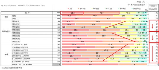 男女で見ると、男性は年齢が上がるほど海外旅行の回数が多くなる傾向にあるが、女性は年齢が上がると旅行回数がやや少なくなるなど、男女間で異なる傾向が存在するようだ。