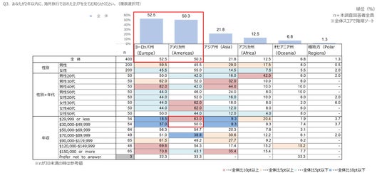年収50,000ドル未満の層は「アメリカ州」が支持を得ており、地理的に訪問しやすいことや短期旅行などで比較的安価に海外旅行を楽しめることが一因と考えられる。