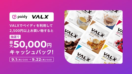 VALXメンバーズストアにて「あと払い(ペイディ)」を利用して、1回あたり2,500円(税込)以上お買い物いただいたお客様を対象に、抽選でキャッシュバックが当たります。