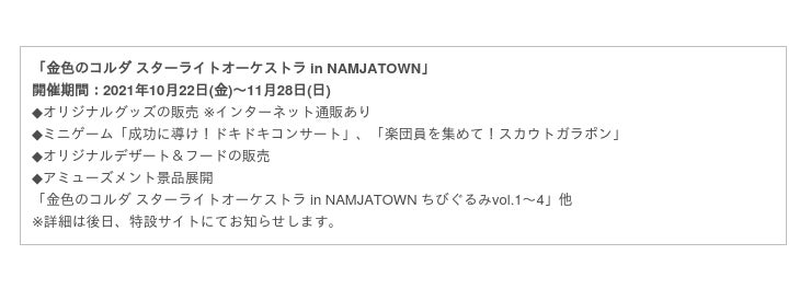 株式会社バンダイナムコアミューズメントが運営する「NAMJATOWN(ナンジャタウン)」(東京・池袋)は、スマートフォン向けゲームアプリ『金色のコルダ スターライトオーケストラ』とのコラボレーション催事「金色のコルダ スターライトオーケストラ in NAMJATOWN」を2021年10月22日(金)から11月28日(日)まで園内のHugood!(ハグッド)街区で開催します。