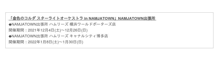 また池袋での会期終了後は「Hugood! from NAMJATOWN」(大阪・梅田)や横浜/博多の「NAMJATOWN出張所」での開催も決定しました。さらにネットクレーンモール「とるモ」や直営アミューズメント施設「namco」の対象店舗でコラボ限定アミューズメント景品「金色のコルダ スターライトオーケストラ in NAMJATOWN ちびぐるみvol.1~4」が登場するなど、全国でお楽しみいただける催事となります。