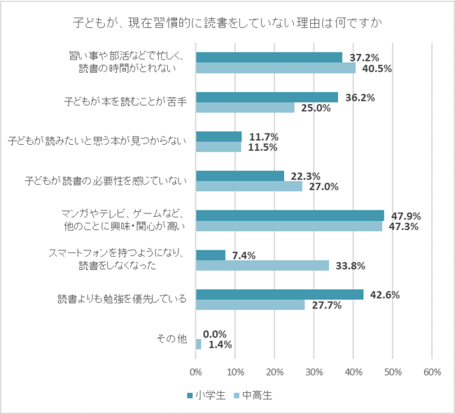 また、中高生では、「スマートフォンを持つようになり、読書をしなくなった」という回答も多かった。スマートフォンを使う時間が増えたことが、習慣的な読書をしなくなる理由のひとつとなっているようだ。
