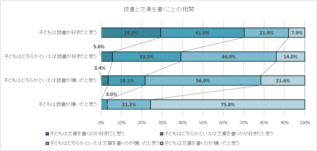 同じく、子どもは文章を書くのが好きだと思うかを聞いたところ、小学生保護者・中高生保護者とも、「子どもは文章を書くのが好きだと思う」「子どもはどちらかといえば文章を書くのが好きだと思う」と回答した保護者は、4割超だった。 次に、読書の好き・嫌いと、文章を書くことの好き・嫌いに関係性を調べた。「子どもは読書が好きだと思う」と回答した保護者の約7割が「子どもは文章を書くのが好きだと思う」「子どもはどちらかといえば文章を書くのが好きだと思う」」と回答した一方、「子どもは読書が嫌いだと思う」と回答した保護者のうち「子どもは文章を書くのが好きだと思う」と回答したのは0%、「子どもはどちらかといえば文章を書くのが好きだと思う」」と回答したのはわずか3.0%だった。子どもが読書好きであれば、文章を書くことも好きな割合が高く、子どもが読書嫌いであれば、文章を書くことも嫌いである割合が高くなる傾向が明らかとなった。