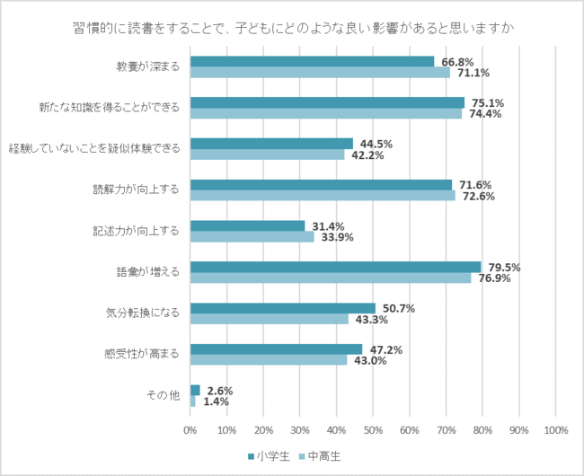 子どもが習慣的に読書をすることで、どのような良い影響があると思うかを聞いた。小学生保護者・中高生保護者とも、最も割合が高かったのは、「語彙が増える」で7割以上にのぼった。また、「新たな知識を得ることができる」「読解力が向上する」といった項目も7割以上だった。
