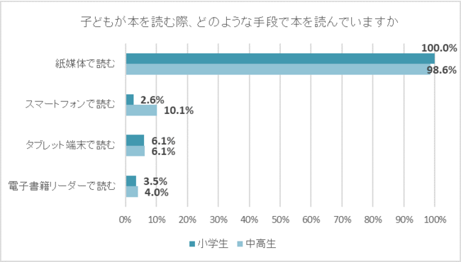 子どもが、どのような手段で本を読んでいるかを聞いたところ、最も多かったのは「紙媒体で読む」で、小学生保護者は100%、中高生保護者も98.6%にのぼった。そのほか、中高生の約1割は「スマートフォンで読む」と回答しているほか、タブレット端末を活用している小中高生も6.1%いることが分かった。