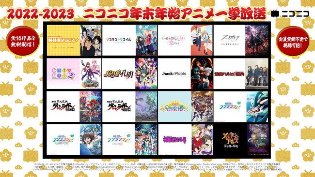 ニコニコ生放送では、12月24日(土)~1月11日(水)にかけて、アニメ全16作品を無料で一挙放送いたします。