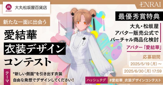 今回は、まだ見ぬ原石のような才能と、自由な発想で「愛結華」の新たな一面を引き出す衣装デザインを募集します。最優秀作品は、大丸・松坂屋アバター販売公式による3D衣装化を検討。さらに、各種メディアでの特集なども予定しています。