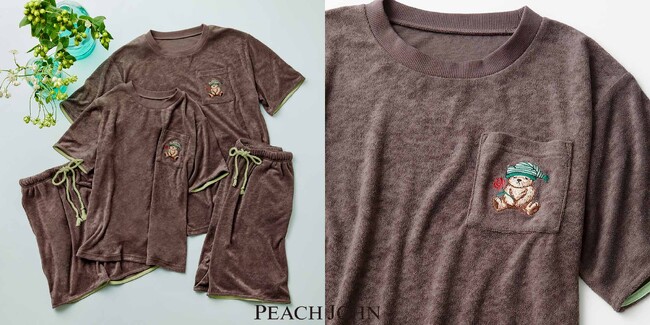 胸ポケットにバラを持ったクマちゃんの刺しゅうとトップス袖口・ボトム裾・ウエスト紐のグリーンカラーがデザインポイント。