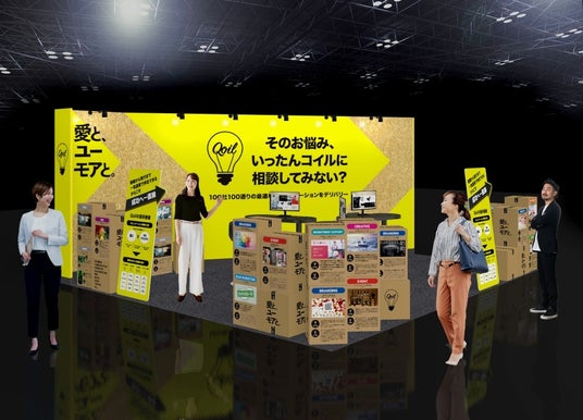 Qoilは、100社100通りのお悩みに対して解決手段を作り出しデリバリーするファクトリーをイメージしてブースを企画・制作しました。ブースでは、コミュニケーションツールとして、実際のクライアントの課題と解決事例をプリントした段ボールボックスをご用意しています。ボックスは1ボックス1テーマで、全部で9つのテーマ(BtoBマーケティング/Web制作/コミュニケーション/動画制作/ブランディング/イベント/クリエイティブ制作/採用ブランディング/LINEを活用した販促・顧客育成ツール「LINKFUN」)があります。それ以外のテーマも含めて個別のご相談も可能ですので、気になるテーマの箱を見つけた方やお悩み事がある方は、ぜひ気軽にお声がけください。