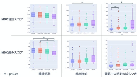 本研究の解析の結果、月経に伴う心身の不調の重症度(MDQスコア)が高いほど、睡眠中央時刻のばらつきが大きくなる傾向が確認されました。また、痛みスコアが高い群では睡眠効率が低下する傾向もみられ、症状の重さと睡眠の質との関連が示唆されました。