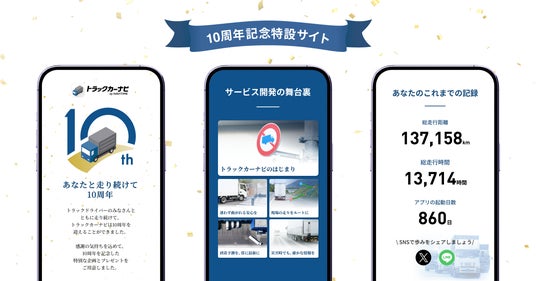 特設サイトでは、『トラックカーナビ』の10年間のサービス開発の変遷を紹介するほか、ドライバーの皆様がサービスを通じて積み上げてこられた「総走行距離」や「利用日数」などの歩みを振り返ることができる、ユーザー専用コンテンツをご用意しました。