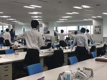 毎朝9時から全社で行うラジオ体操により、肩こりの改善や呼吸機能の促進、消化器の働きの改善、腰痛の予防を図っています。在宅勤務下でもラジオ体操ができるよう、社内イントラネットや新型コロナ特設サイト、安全衛生委員会・営業所安全衛生会議などでも、ラジオ体操の動画を提供しています。