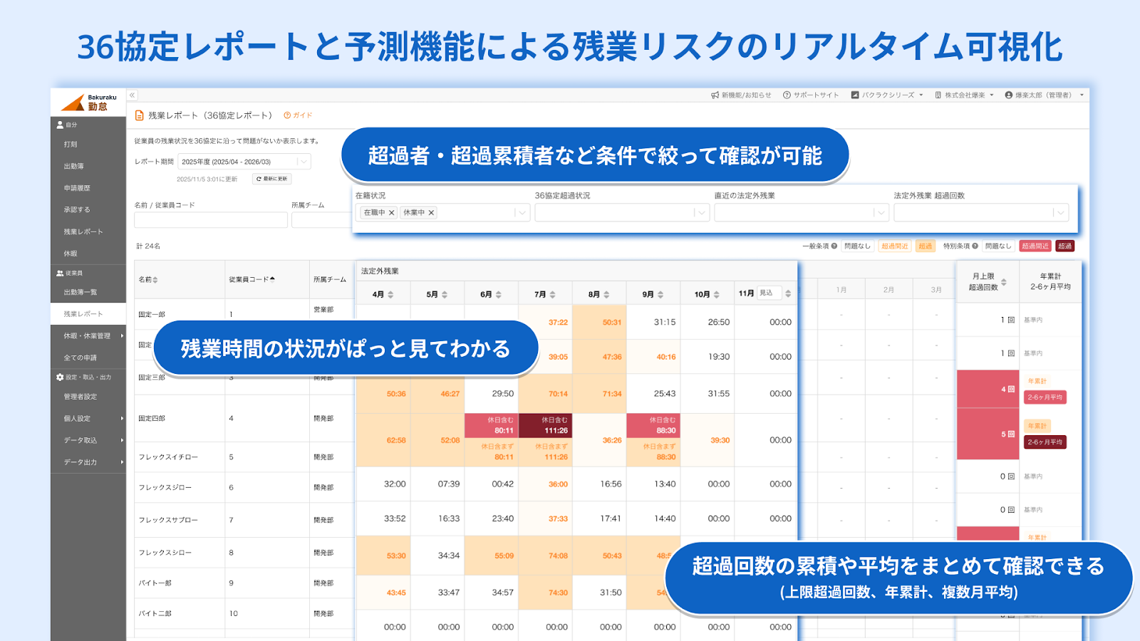 バクラク勤怠の「36協定レポート(残業レポート)」は、管理者設定に基づき従業員の残業状況を一覧で確認できる機能です。未承認の申請内容も反映してリアルタイムに表示され、「超過間近」「超過」などのアラートで法令違反リスクを事前に把握できます。