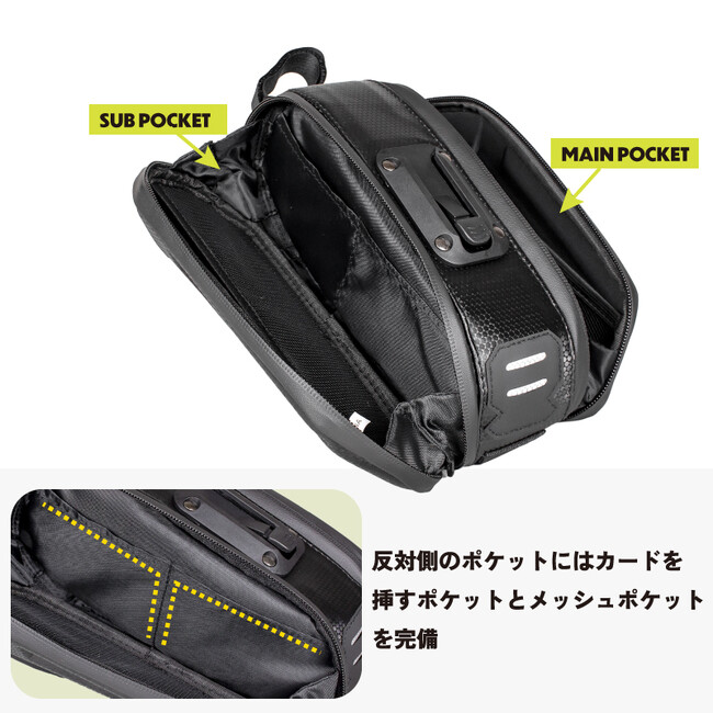 固く衝撃に強く、型崩れしないハードシェルタイプのサドルバッグです。容量は大きめでチューブや空気入れなどパンク修理のアイテムなどが全て収納可能。反対側にもサブポケットがあり、薄いカード等が収納出来ます。