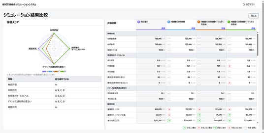 各交通手段の利用状況やサービスレベル、デマンド交通の乗合率、施策全体の事業コストなど、多岐にわたる評価指標を提供します。これにより、交通施策が利用者、事業者、地域全体に与える影響を総合的に評価し、公共交通機関による移動手段の確保が難しい「交通空白」の解消や持続可能な地域交通の実現に向けた最適な計画立案を支援します。