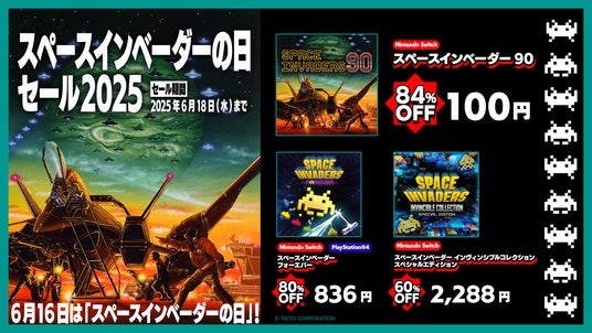 株式会社タイトー(本社:東京都新宿区、以下タイトー)は、6月16日の「スペースインベーダーの日」を記念して、対象のNintendo Switch(TM)用ソフト(ダウンロード版)およびPlayStation(R)4用ソフト(ダウンロード版)が最大84%オフとなる、「スペースインベーダーの日セール2025」を実施いたします。