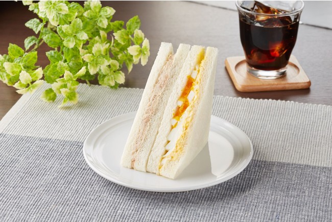 【内容】ビネガーやブイヨンで味付けし、オニオンサラダを合わせたツナサラダと、たまごサラダとゆでたまごをサンドしました。たまごサラダをコクと風味を感じる味わいにリニューアルしました。