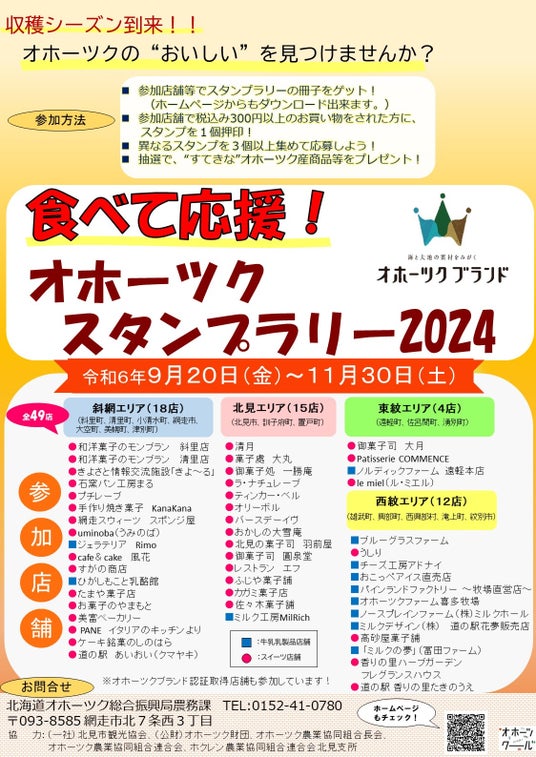 北海道オホーツク総合振興局では、収穫シーズンに管内産農畜産物を使用した菓子等を扱う店舗を巡り、オホーツク地域の特色ある農業や多彩な農畜産物の魅力を「知る」、「学ぶ」、「食べる」ことにより、管内農業の理解醸成や地産地消を促進し、オホーツクの農業と生産者を応援する人を増やすことを目的に「食べて応援!オホーツクスタンプラリー2024」を実施中です!