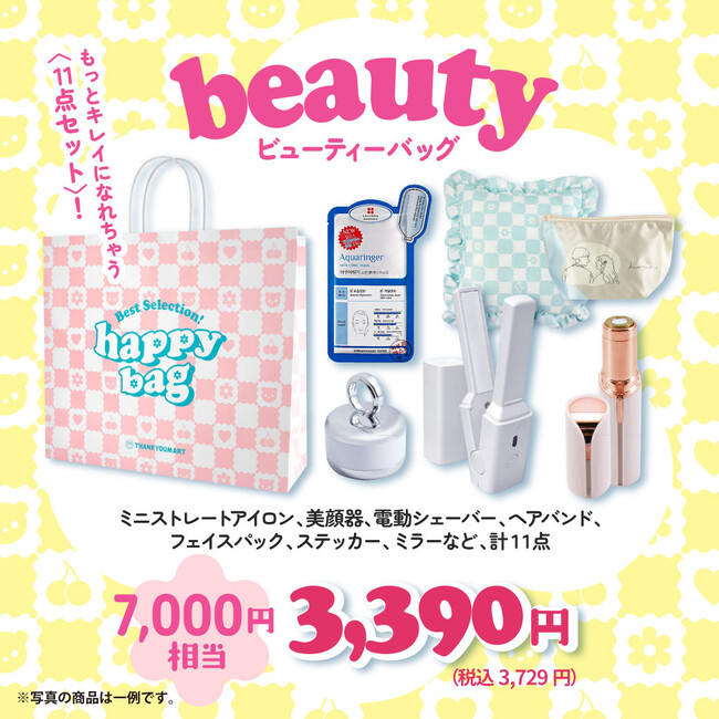2024年1月1日(月)より発売の福袋『HAPPY BAG』では、「ミニストレートヘアアイロン」を含む美容関連アイテム11点が詰まったお得なバッグ「ビューティーバッグ」(3,390円(税込3,729円))を展開します。