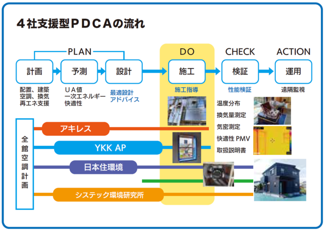 今回受賞した「中小工務店向け支援型高性能全館空調システム(製品名:エクセレント ハウジング システム)」は、“高断熱、高気密+全館空調”を基調とし、住環境とエネルギーの専門技術者を持たない地域ビルダーでも、専業メーカー4社が支援することでこれを実現できるスキームとなっています。全館空調システムを設計するシステックが中心となり、断熱・遮熱性能支援を行うアキレス、開口部性能支援を行うYKK AP、換気計画・気密性能支援を行う日本住環境の4社がタッグを組み、建築計画に基づく「システム提案⇒設計⇒施工⇒検証」のプロセスを各社が適宜サポート。快適な住宅の供給と、シミュレーションや実証データによる継続受注のサポート、遠隔計測によるアフターフォローを確実に行えるようにし、全館空調の導入経験のない工務店でも安心して導入できるように営業支援を全国各地で展開します。