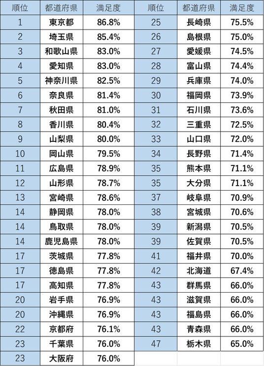 全国2,250名の既婚者を対象に「夫婦関係について全体として満足していますか」の質問をした結果、満足しているは全体の24.7%、まあ満足しているは50.4%、あまり満足していない14.6%、満足していない10.4%となり、満足している、まあ満足しているの合計は全体の75%となりました。また、満足している、まあ満足しているを合算した回答者比率(以下、「夫婦満足度」)を都道府県別ランキングでみてみると、夫婦満足度として最も回答比率が高かった都道府県は東京都(86.8%)、次いで埼玉県(85.4%)となり首都エリアが上位を占める結果となりました。一方で最も回答比率は低かったのは、栃木県(65.0%)となりました。