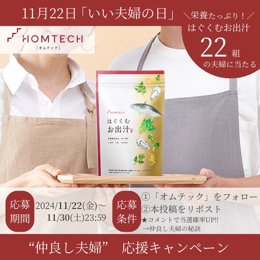 この度、日々の食事をきっかけに、夫婦仲良し♪を応援するべく、オムテックの「はぐくむお出汁」が当たる、いい夫婦の日限定プレゼントキャンペーンを実施いたします。詳細はオムテック公式Xをご覧ください。