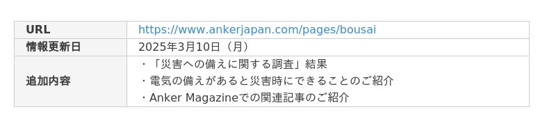 本調査の結果を踏まえ、本日アンカー・ジャパンは必要な情報をまとめた「防災には『衣食住“電”』の備えを」と題した特設ページに、新たにコンテンツを追加し、公開いたしました。今後も、Ankerグループ製品で一人でも多くのお客様の不安を軽減し、電気を備えることでもたらされる大きな安心感をお客様にお届けできるよう、防災意識向上やもしもの時のための啓発活動などの幅広い取り組みも行って参ります。
