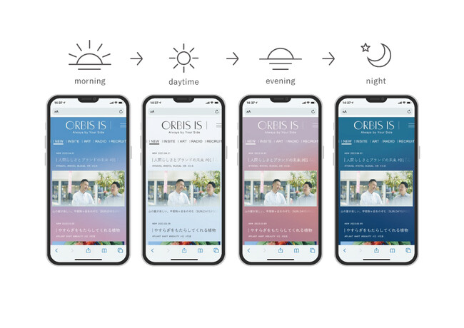 何気ない毎日に寄り添い、これまでにないチャレンジを通して“ここちよい”日常を提供したい。そんな想いから、時間と季節によって異なる空のように、「ORBIS IS」を訪れる時間によって背景色が変化するデザインにしました。自然のバイオリズムに合わせた時間と色の演出により、毎日触れるスマートフォンからふと空を見上げて息抜きをするような柔らかさで、一人ひとりの生活に寄り添いたいというメッセージを反映させています。