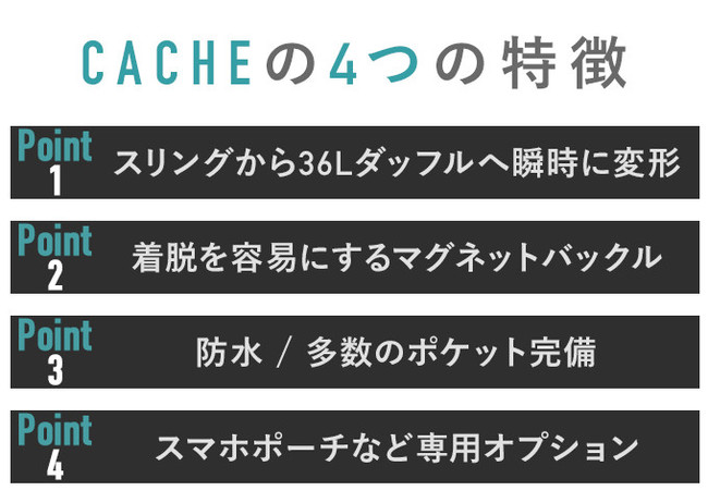 2022/4/30(日)までの期間中、レビュー記事/動画をご作成いただけるメディア関係者を対象に「マグネット式スリング兼用ダッフルバッグ【CACHE】」のサンプル品を無償で提供