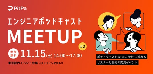 株式会社オトバンク(本社:東京都文京区、代表取締役社長:久保田裕也)が運営するポッドキャスト制作事業「PitPa」は、エンジニア同士の交流を促進するため、人気エンジニアポッドキャスト番組が一堂に会するミートアップイベント「エンジニアポッドキャスト meet up Vol.2」を2025年11月15日(土)に開催します。