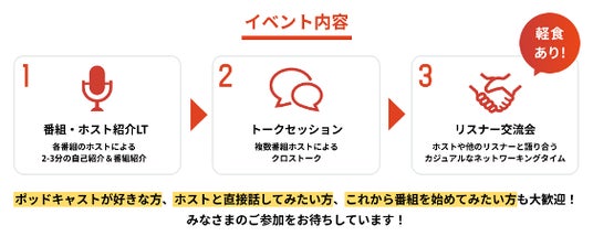 内容 番組ホストたちによるトークセッションや、軽食を囲んでの交流会など、ポッドキャストの"向こう側"に触れられる特別なイベントを開催します。 普段は音声でしか聞けないホストたちと直接会って話せるチャンス。 ポッドキャストを「聴くだけ」から「一緒に楽しむ」場へ、ぜひご参加ください!