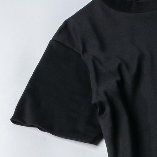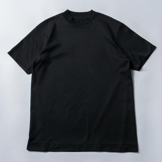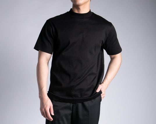原料の良さを最大限に引き出すスムス組織、さらに太番手の双糸を限界まで度詰めで編み立てることで、超長綿ならではのもっちりとした柔らかな風合い、きめ細やかななめらかさ、自然な光沢感を実現。一枚で着てもボディラインを拾いにくいしっかりとしたウェイトと厚みが特徴です。デザインは、立体裁断によるパターンを採用することで、体に沿うフィット感のあるシルエットを実現。ネックラインには、ジャケットと合わせた際にフォーマル感がありながら、ジャケットの襟が直接肌に触れないようミリ単位で調整を繰り返したセミモックネックをセレクトしました。