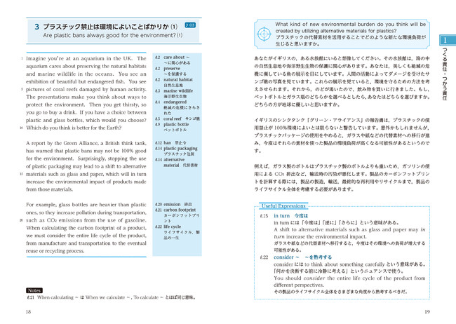 本書は5つの章(「つくる責任・つかう責任」「海の豊かさ」「陸の豊かさ」「生態系の豊かさ」「気候変動」)からなり、各章に英文を3~4本ずつ収録しています。英文は、単なるニュース、ファクトではなく、簡単には答えの出ない問題(issue「イシュー」)を扱います。「日本が農産物を輸入することが発展途上地域に『豊かさ』をもたらす」「レジ袋やペットボトルの使用を減らすことが環境の保護に役立つ」といった「社会常識」をいったん疑ってみることで、クリティカル・シンキングを磨き、より深い内容について話し合える総合力を伸ばします。「英語で世界のニュースやSNSなどを読みたい、英語でも発信したい方」の他、「英語を学び直したい、英語力をもっと伸ばしたい方」にもおすすめの1冊です。