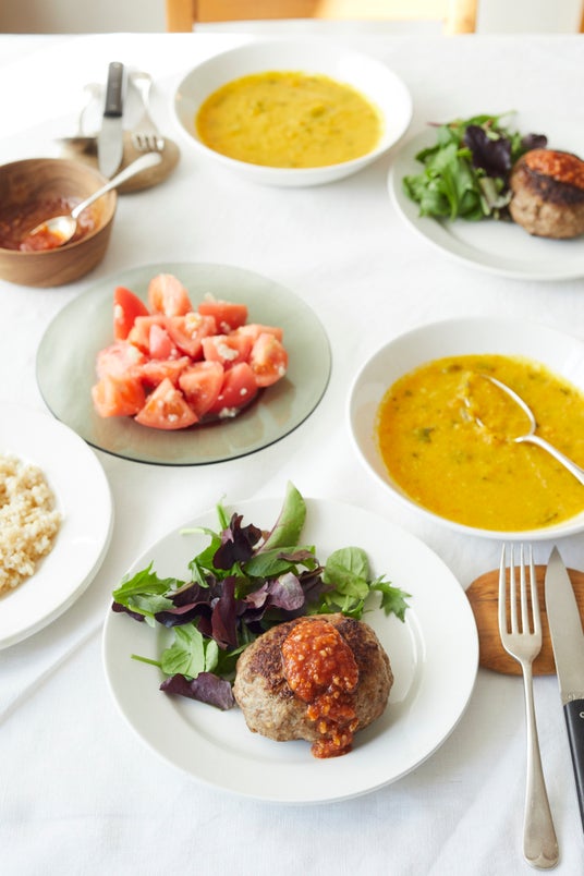 玉ねぎ麹のハンバーグ、トマトの玉ねぎ麹マリネ、かぼちゃの豆乳スープ
