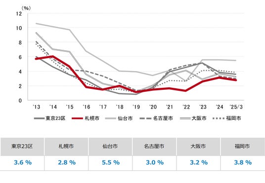 三幸エステート株式会社(本社:東京都中央区、取締役社長:武井重夫)は、2025年3月度の札幌市オフィス賃貸状況(空室率&現空面積:全規模、募集賃料&募集面積:全規模、規模別空室率、主要エリア※1空室率:全規模)および全国6大都市(東京・札幌・仙台・名古屋・大阪・福岡)の大規模ビルのマーケットデータをまとめた「オフィスマーケット2025年4月号札幌」を公表します。