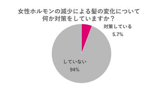 一方で、94%が女性ホルモンの減少による髪の変化に「対策していない」という結果が明らかになりました。髪にとって女性ホルモンが重要であると理解しつつも、女性ホルモンの減少に対してどのように対処したらいいのか分からない方も多いことが窺えます。