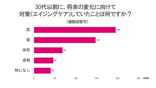 一方、30代以前にケアをしていたことを聞いたところ、第1位は「肌」という結果になりました。30代以前では、多くの方が髪以上に肌のケアに注力していたことが分かります。