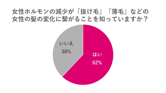 髪の変化には、40代半ばから一気に減少すると言われている「女性ホルモン」の低下が原因の1つとして考えられます。40代~60代女性に調査したところ、「女性ホルモン」の低下が髪の変化に関わっていることを知っている人は62%でした。