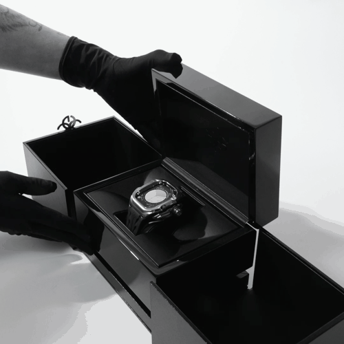 製品は、内装にブラックレザーを用いたハンドメイドのブラックオーク製ボックスに収められます。商品の魅力を最大限に引き出すために、開封構造にも工夫を凝らし、慎重にデザインしました。単なる包装物に留まらず、贅沢で魅力的な"開封体験"をお届けします。