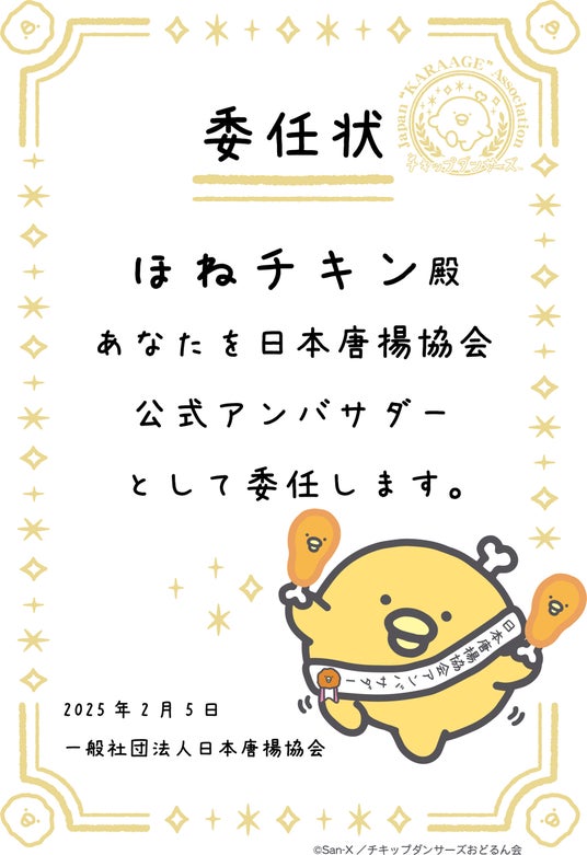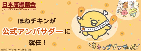 サンエックス株式会社(本社:東京都千代田区)は、「チキップダンサーズおどるん会(※)」製作アニメ「チキップダンサーズ」に登場するキャラクター「ほねチキン」が『日本唐揚協会 公式アンバサダー』に就任したことを、2月9日(日)の肉の日にお知らせします。