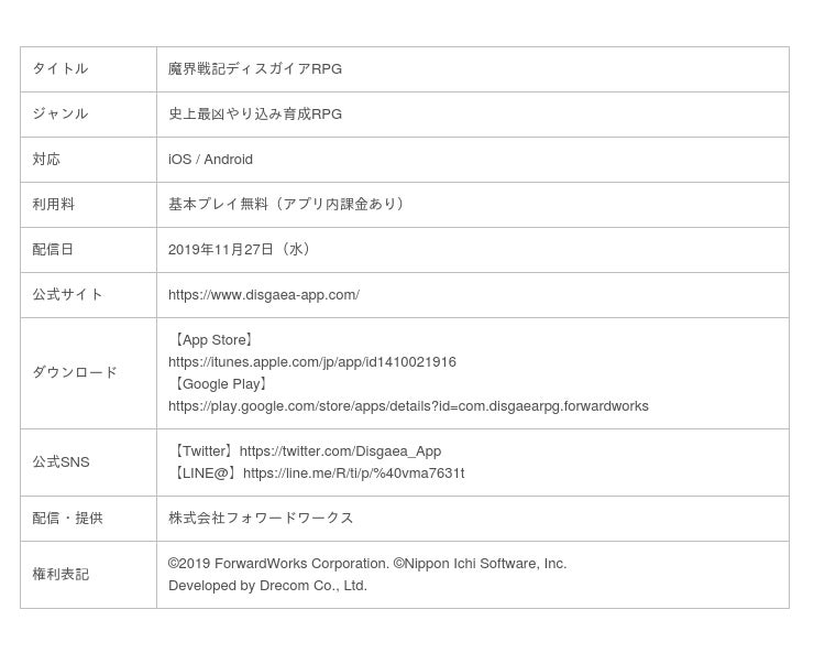 『魔界戦記ディスガイアRPG』は、シリーズの世界観や、Lv9999まで育てて億を超えるダメージを叩き出す育成などのやり込み要素を継承しながらも、「魔界戦記ディスガイア」シリーズの歴代キャラクターたちが登場するオリジナルストーリーや、いつでもどこでもサクサク遊べるコマンドバトルを採用し、スマートフォン向け完全オリジナルゲームとしてお楽しみいただけます。
