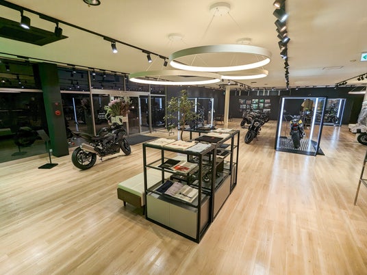 白を基調に広々とした開放感のある店内。モーターサイクルとプラザアパレルがゆったりと展示され、どなたでも楽しめる空間としています。