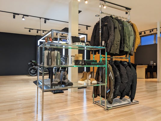 モーターサイクルライフを彩るプラザアパレルやグッズは店内のアイランドスペースに展示。実際に手に取って確かめやすいレイアウトです。