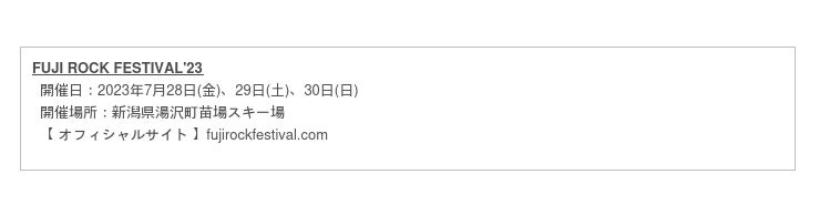 また、フジロックの関西でのプレイベントを、6月にロゴスランドで開催します。フジロックの雰囲気を楽しめる1日限りのスペシャルイベントです。7月28日(金)から開催されるフジロック本番に向け、さらに気分を高められるプレイベントにもご注目ください。