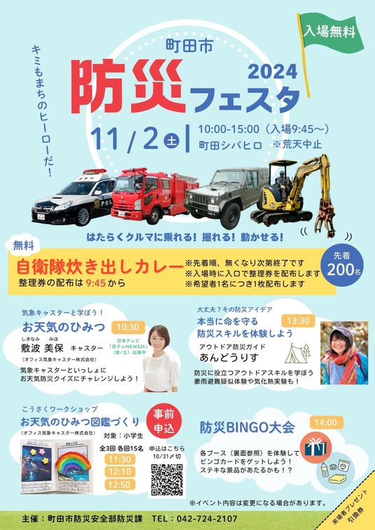 町田市は、幅広い世代の防災意識の高揚に向け、「楽しい」に重点を置いた体験型の防災イベントとして「町田市防災フェスタ2024」を実施します。
