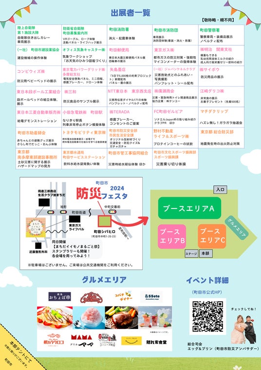 町田消防署、町田警察署、東京都南多摩東部建設事務所、陸上自衛隊第1師団第1施設大隊、防衛省自衛隊東京地方協力本部 町田募集案内所、町田郵便局、東京電力パワーグリッド(株) 多摩総支社、東京ガス(株)、NTT東日本 東京西支店、小田急電鉄(株) 町田駅、(株)三和、(一社) ジャパンケネルクラブ、「5日で5,000枚の約束」プロジェクト実行委員会 矢島畳店、東日本段ボール工業組合、東日本三菱自動車販売(株)、トヨタモビリティ東京(株)、(株)明治 関東支社、(株)廣瀬商会、FC町田ゼルビア、(株)サイボウ、コンビウィズ(株)、マチダクリップ、(株)TERADA、江崎グリコ(株)、町田市助産師会、町田市管工事協同組合、(一社)町田市建設業協会、東京都 総務局 総合防災部 防災戦略課 調整担当、東京都水道局 町田サービスステーション、オフィス気象キャスター(株)、野村不動産ライフ&スポーツ(株)、町田市消防団、町田市防災安全部市民生活安全課、町田市文化スポーツ振興部スポーツ振興課