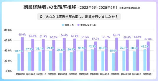 副業経験者の推移を見ると、直近半年間で副業を「実施した」の回答者率は前回調査(2025年2月)の38.6%から42.2%へ3.6ポイント増加し、今後の副業意向も「実施するつもりだ」の回答者率が前回調査の48.3%から51.8%へ3.5ポイント増加していました。また、調査を開始した3年前(2022年5月)の調査結果と比較してみると、副業経験者は8.1ポイント、副業意向は8.6ポイント増加しており、副業というはたらき方の選択肢が、徐々に広がっていることが分かります。