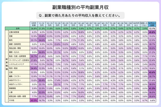 また、副業職種別で見ると、副業で月30万円以上稼いでいる割合が高いのは「企業の経営者(49.8%)」、次いで「広報(43.6%)」、「事業開発(41.3%)」となり、いずれも40%を上回る結果となりました。単価の高い印象がある社外顧問や副業CxOだけでなく、自治体やスタートアップなどからPR知見やメディアリレーションを必要とされる広報、社外の専門家に実践的なアイデアを求める大手新規事業などの現場で、比較的高い副業収入を得やすいことが伺えます。