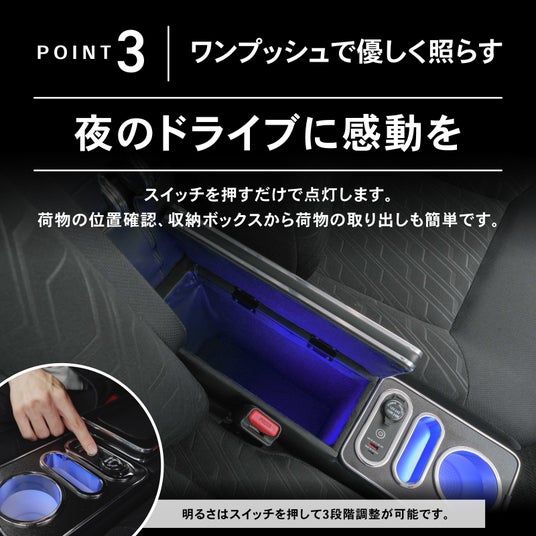 ルーミー専用 900系対応 LEDアームレスト/コンソールボックス。「LEDライト搭載」で、夜間でも安心して運転できるのが魅力!置くだけで簡単に設置できるので、届いたその日からすぐに使用可能。
